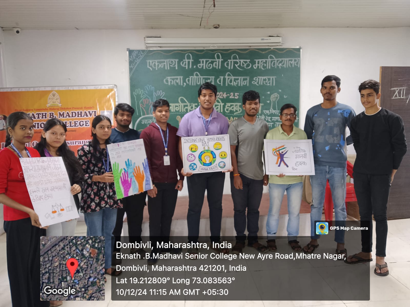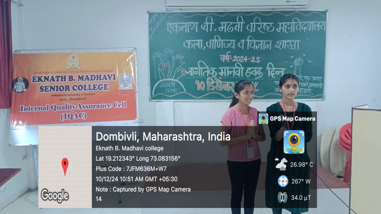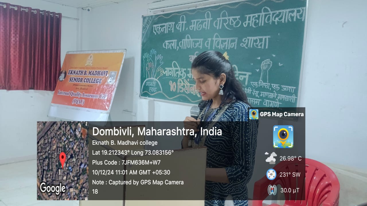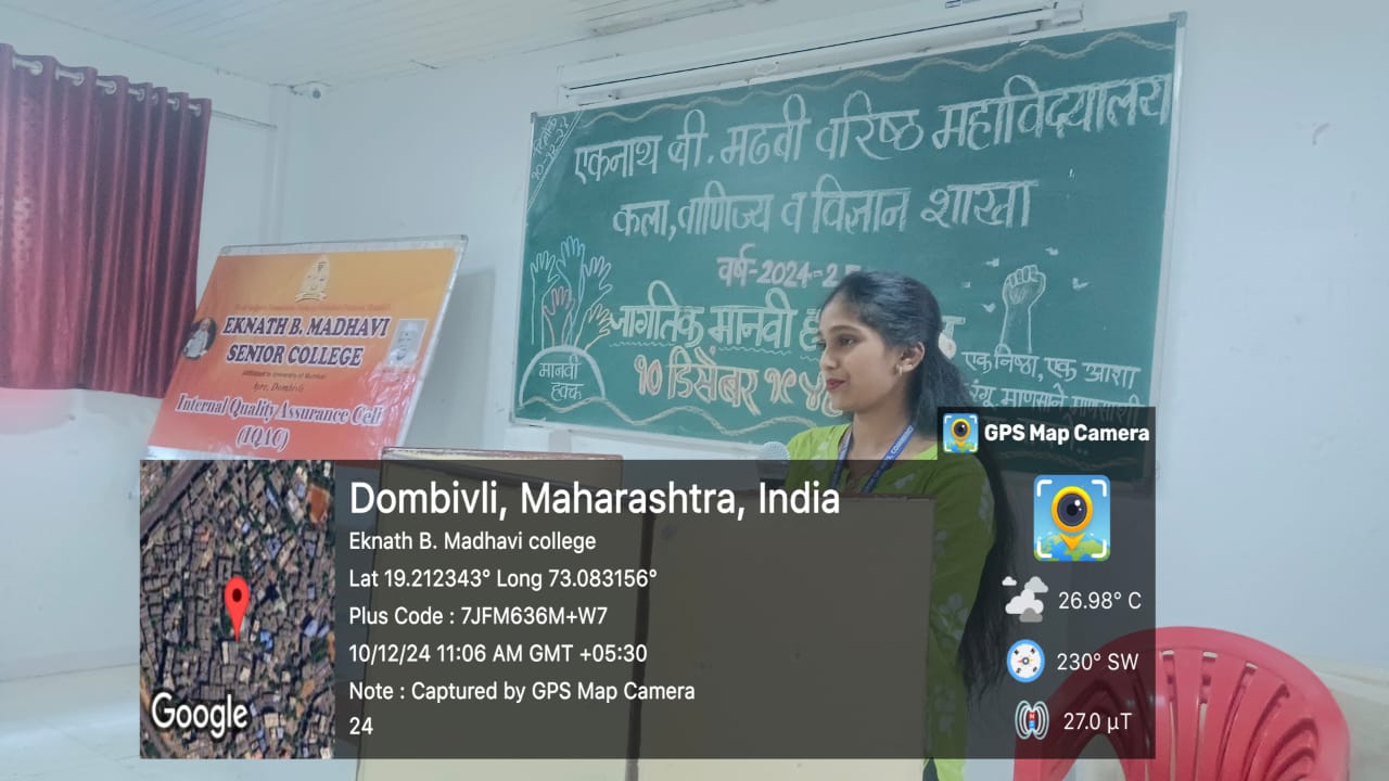 Eknath.B.Madhavi Senior College, Dombivli, Thane Dist.( College code 607 – Affiliated to University of Mumbai ) has organised a program on Human Rights Day Dt.10th December,2024 at 10.30 a.m in college auditorium.The theme for Human Rights Day of 2024 is”Our Rights, Our Future Right Now”, emphasizing the role of Human Rights in empowering individual and communities to shape a better future.Our students enthusiastically participated in today’s program.